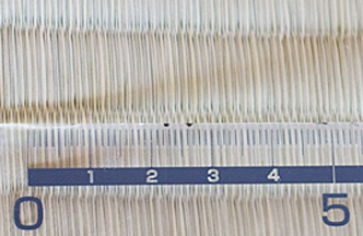 畳表のヒゲと言われるい草の先端部分をご覧下さい。丸みを帯びたイ草は、茎の充実が良く、表皮も厚いので擦り傷などになりにくい傾向にあります。一方で楕円型に潰れたイ草は、茎の充実が悪く、表皮も薄いので擦り傷などの原因になる傾向にあります。い草そのものに実が入っており、写真のように織込み密度が高いと、より耐久性もある畳表となります。